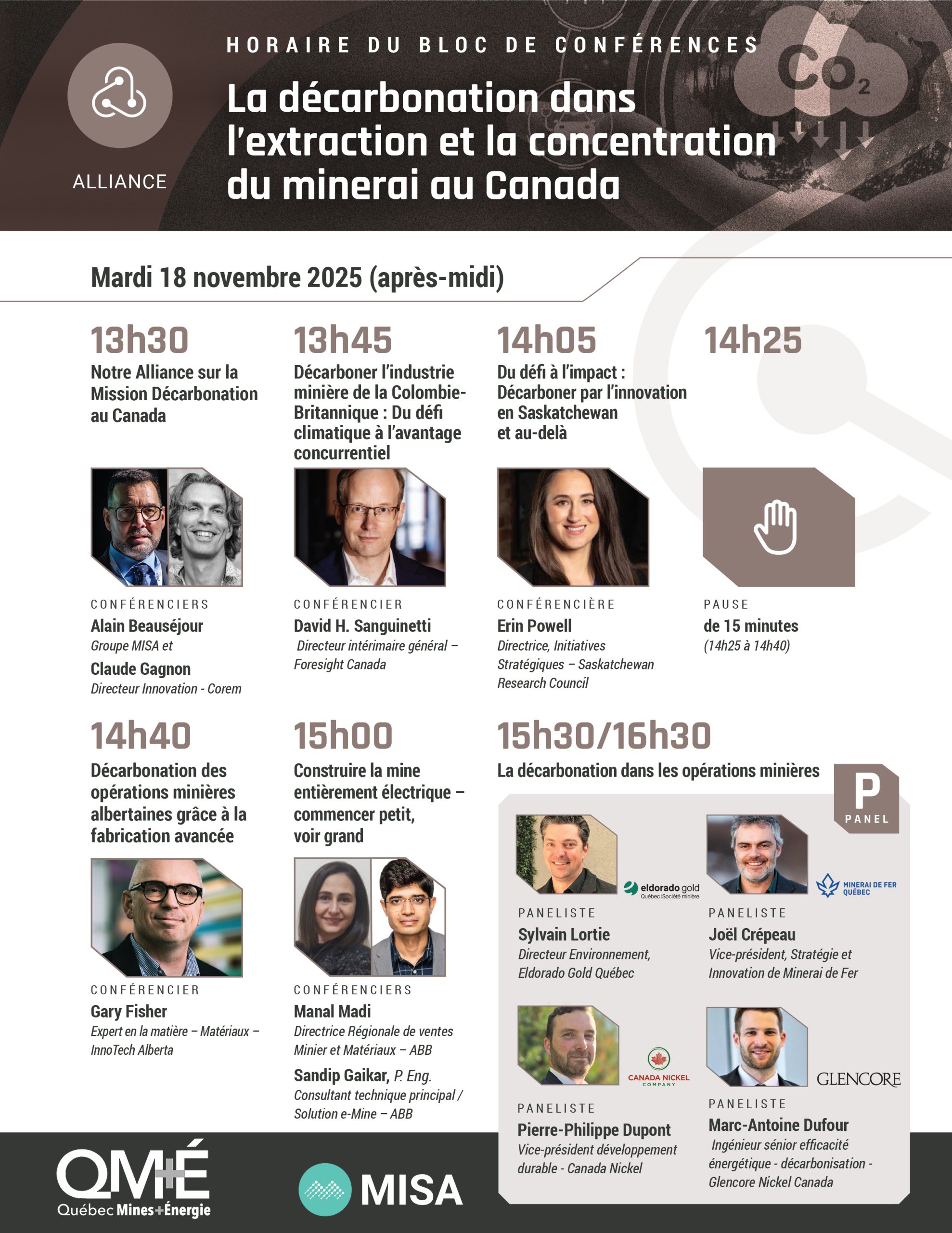Le 18 novembre à 13h30 dans la salle 303AB, Groupe MISA s’associe à Corem pour un second bloc de conférences intitulé : « La décarbonation dans l’extraction et la concentration du minerai au Canada ».