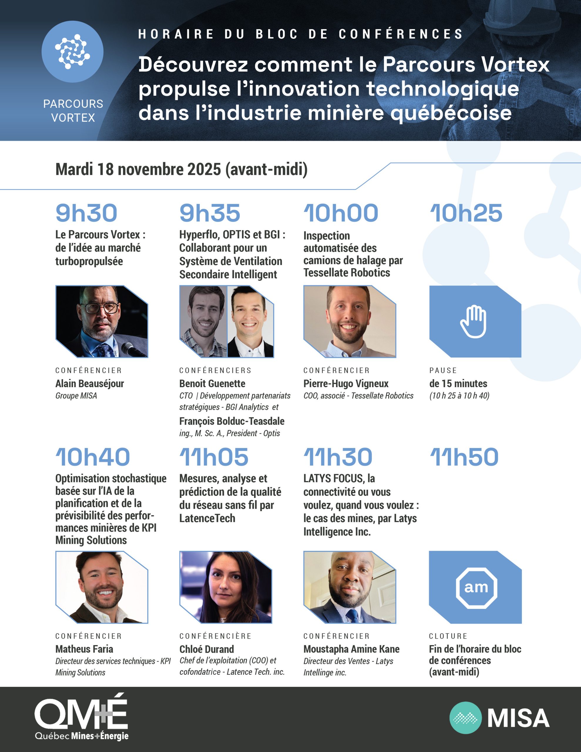 Le 18 novembre à 9h30 dans la salle 304AB, le Groupe MISA présentera un bloc de six conférences sous le thème : « Découvrez comment le Parcours Vortex propulse l’innovation technologique dans l’industrie minière québécoise ».