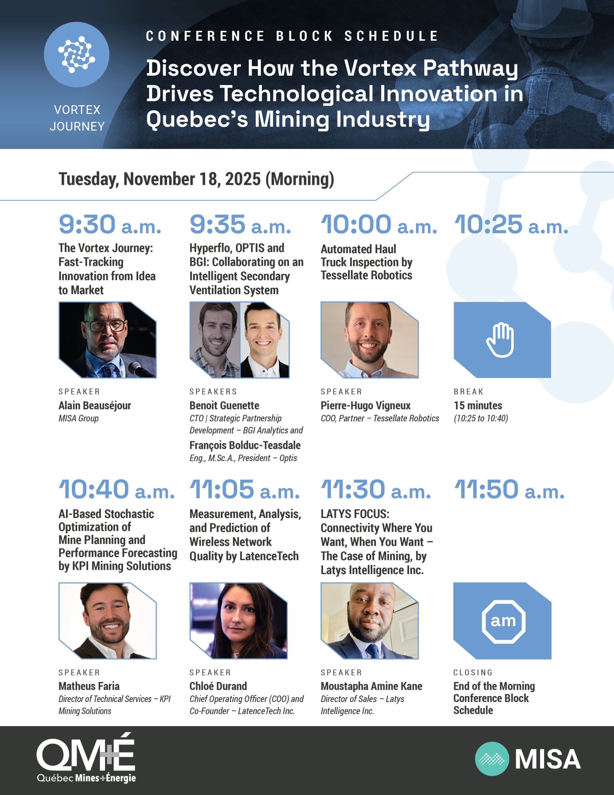 This session will highlight the Vortex Journey’s role as a catalyst for digital and technological transformation within the mining sector. From idea generation to market deployment, the speakers will present real-world projects, innovative partnerships, and tangible results for the entire mining value chain.