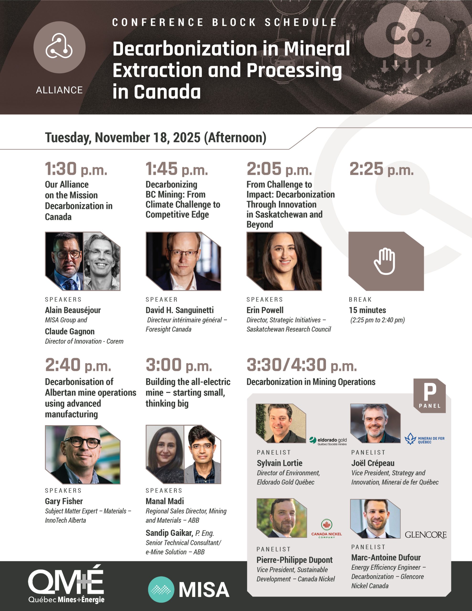 This segment will include five presentations and an expert panel featuring leaders from across Canada. Together, they will explore innovative approaches to reducing the carbon footprint of the mining sector — from British Columbia to Alberta, through Saskatchewan and Quebec.