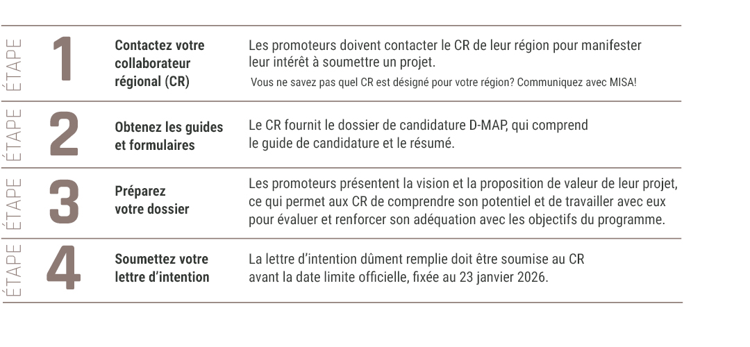 Les projets démontrant un alignement stratégique fort avec la mission et les objectifs de D-MAP seront retenus pour le Portfolio Québec de D-MAP et contribueront directement à la feuille de route pancanadienne, coconstruite par l’ensemble des Collaborateurs régionaux de Mission Décarbonation.